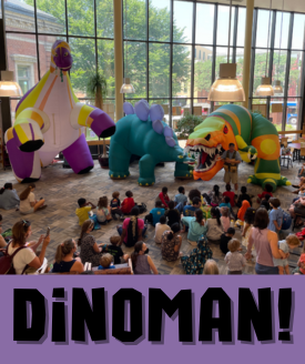 Have no fear, DinoMan is here! Stomp on into the library-you'll be taken on a magical trip throughout the Mesozoic era, with merry mayhem, magnificent props, and enormous inflatable dinosaurs.