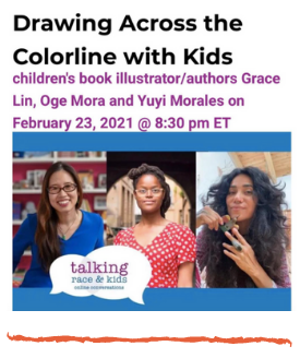 We will reveal the portraits Grace, Oge and Yuyi drew of each other, share their suggestions for supporting kids to see and draw characters of color, and take questions and comments from the EmbraceRace community. Join us!