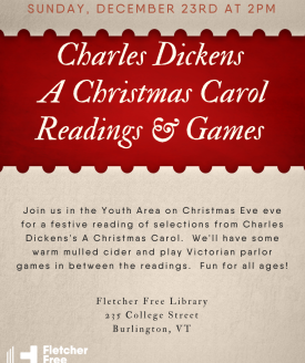 Join us in the Youth Area on Christmas Eve eve for a festive reading of selections from Charles Dickens's Christmas stories, including A Christmas Carol and The Cricket on the Hearth. We'll have some warm mulled cider and play Victorian parlor games in between the readings. Fun for all ages!