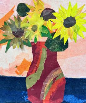 Exhibit of sunflower collages and prints made by 6-8th graders at Edmunds Middle.
