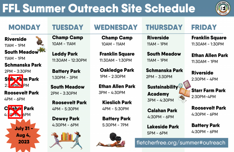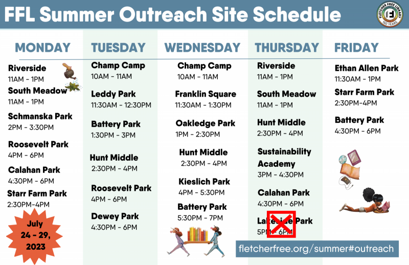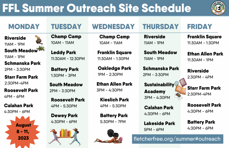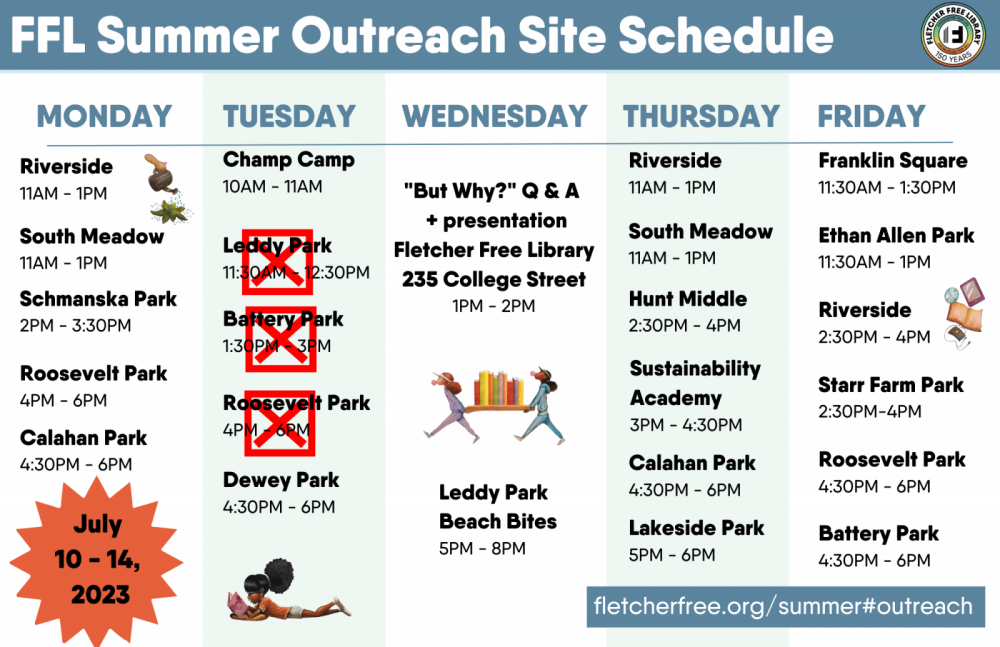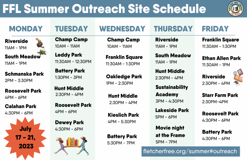- Meet with with Library staff for activities and t-shirts (while they last) at Burlington schools, Burlington parks and meal sites and community centers!